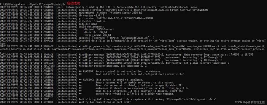 在启动MongoDB的同时,创建数据库文件夹,我当前存储到E盘mongodb\data\db文件夹名称必须符合规范,不能有中文、空格和特殊符号,只能使用英文、数字和下划线在设定的文件夹中,存储MongoDB相关的数据库文件启动命令:mongod.exe --dbpath E:\mongodb\data\db
