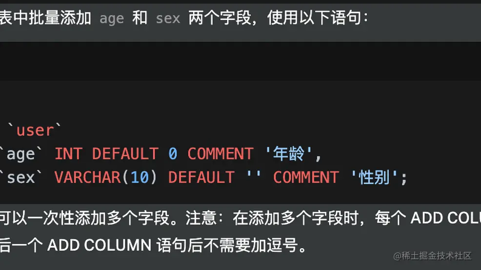 ADD COLUMN `sex` VARCHAR(10) DEFAULT '' COMMENT '性别';使用上面的语句可以一次性添加多个字段。注意:在添加多个字段时,每个 ADD COLUMN 语句都需要以逗号结尾,最后一个 ADD COLUMN 语句后不需要加逗号。