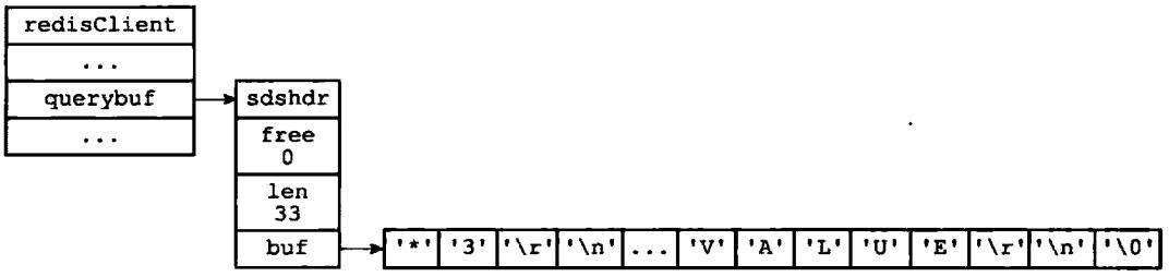 继续以上一小节的SET命令为例子,图1-2展示了程序将命令请求保存到客户端状态的输入缓冲区,客户端状态的样子