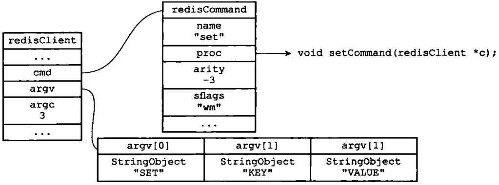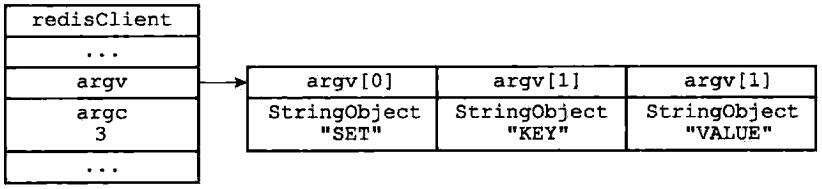 因为执行命令所需的实际参数都已经保存到客户端状态的argv属性里面了,所以命令的实现函数只需要一个指向客户端状态的指针作为参数即可。继续以之前的SET命令为例子,图1-6展示了客户端包含了命令实现、参数、参数个数的样子
