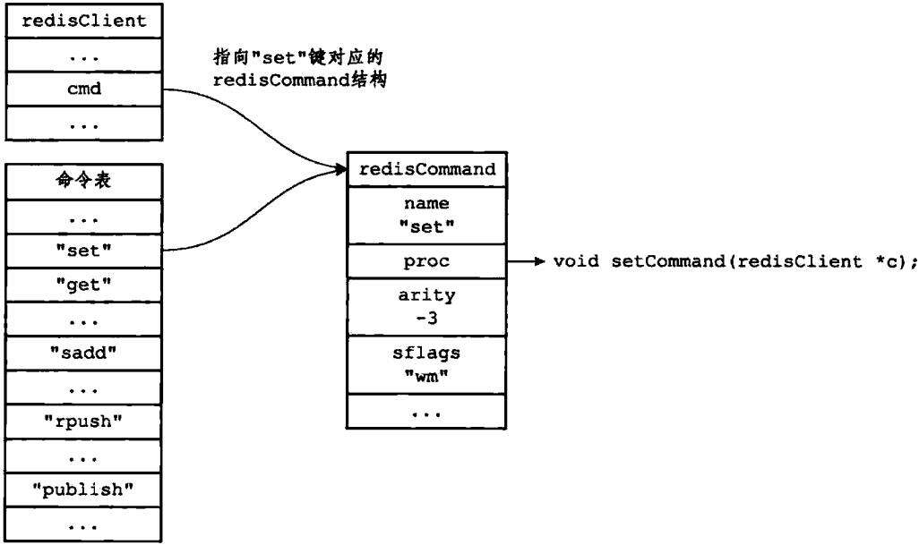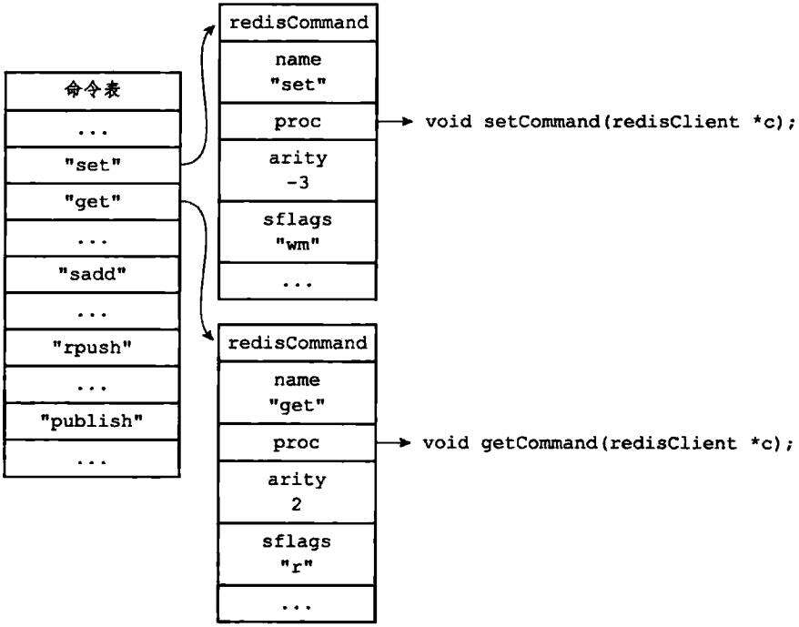 图1-4展示了命令表的样子,并以SET命令和GET命令作为例子,展示了redisCommand结构体: