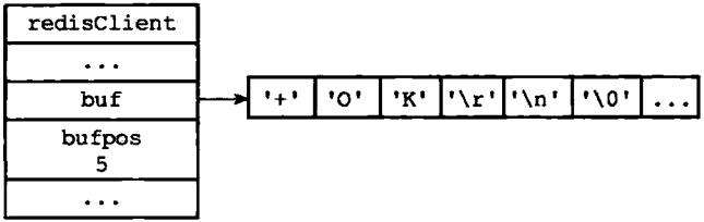 对于前面SET命令的例子来说,函数调用setCommand(client)将产生一个"+OK\r\n"回复,这个回复会保存到客户端状态的buf属性中,如图1-7所示