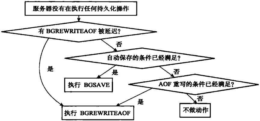 - 检查服务器设置的AOF重写条件是否满足,如果条件满足,并且服务器没有执行其他持久化操作,那么服务器将开始一次新的BGREWRITEAOF操作(因为条件1和条件2都可能会引发新的持久化操作,所以在这个检查中,程序会再次确认服务器是否已经在执行持久化操作了)