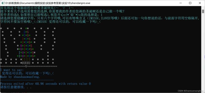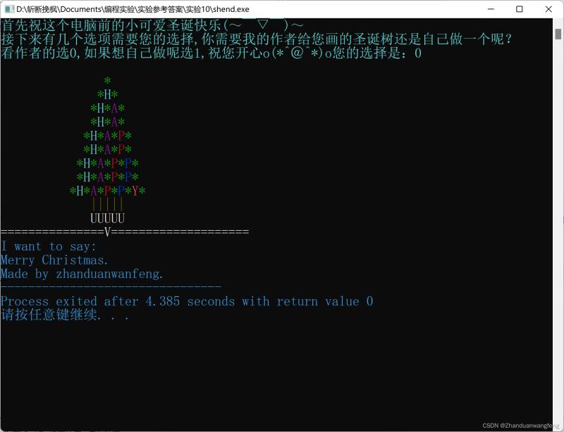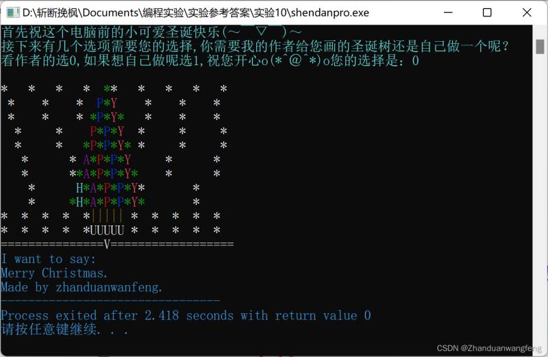 printf("接下来有几个选项需要您的选择,你需要我的作者给您画的圣诞树还是自己做一个呢?");