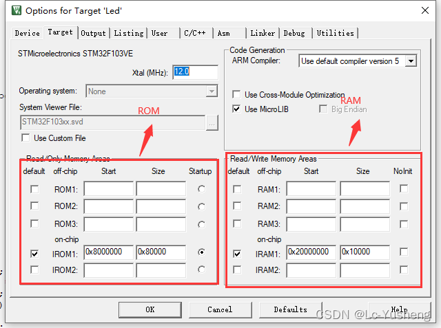 从图片中可以看出ROM的地址分配是从0x8000000开始,整个大小为0x40000,这个部分用于存放代码区和文字常量区。RAM的地址分配是从0x20000000开始,其大小是0xC000,这个区域用来存放栈、堆、全局区(.bss段、.data段)。与代码结果显示进行对比,也可以看出对应得部分得地址与设置的是相对应的。