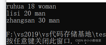 printf("%s %d %s\n", s[i].name, s[i].age, s[i].sex);