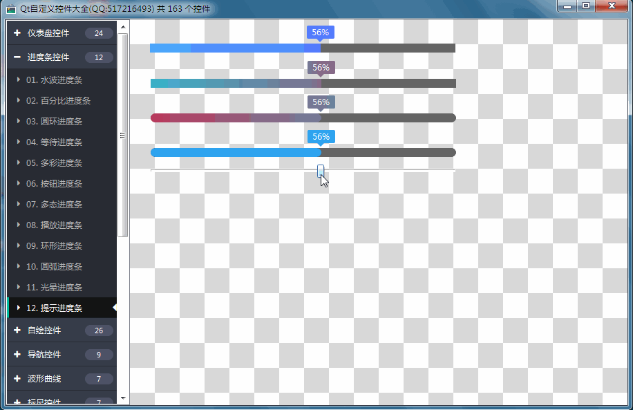 我们在很多的安装包中,在安装过程中,经常可以在底部看到一个漂亮的进度条,上面悬浮着显示对应的进度,然后底部进度多种颜色渐变展示,Qt自带的进度条或者操作系统的进度条样式,不够炫,这次索性直接来个自定义绘制实现,至于是继承QWidget类还是QProgressBar类,都无所谓,如果是继承自QWidget类的话,就需要自己设置最大值最小值范围值,而继承自QProgressBar的话就可以直接用自带的函数来实现。这次编写的进度条,提示信息的背景色也是和下面的进度颜色完全一致跟着变化的。