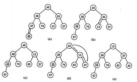 如图建堆初始过程:无序序列:(49,38,65,97,76,13,27,49)