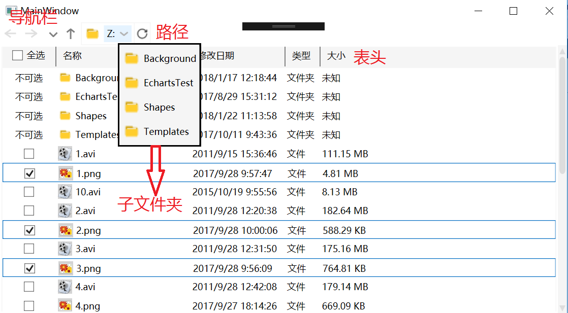 这个部分是整个文件和文件夹的显示部分,再三权衡下,决定采用自定义DataGrid的方式来展现整个部分。