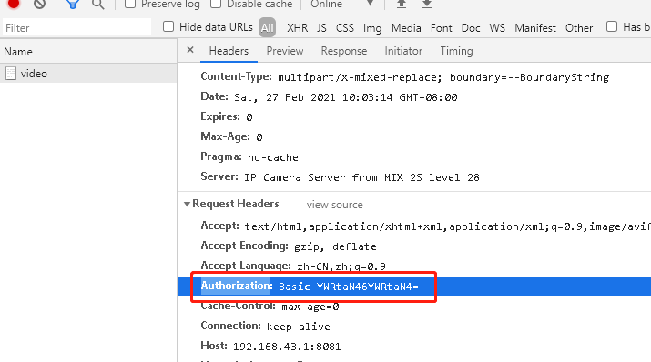 在使用IP摄像头App读MJPEG流时发现需要密码,使用浏览器直接访问会弹出输入账号密码框,通过解析请求发现其实就是在请求头中添加了一个请求头Authorization: