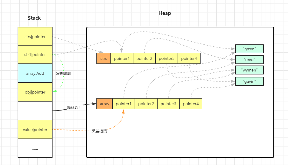 非常妙的是,当你实例化两个一样的类型参数string,是共享一份类型规格的,也就是同享一份本地代码,因此上面的代码在线程堆栈和托管堆的大致是这样的: