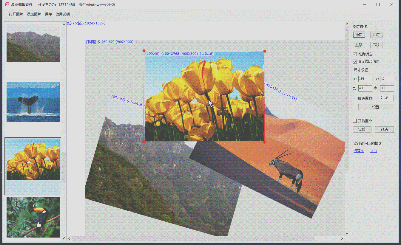 对图片相关参数修改后,需要调用refresh,强制重画。调用GDI+。根据图片在列表的顺序调用(也就是根据图层)。调用时,根据设定显示区域,旋转角度等,做变换后再画。
