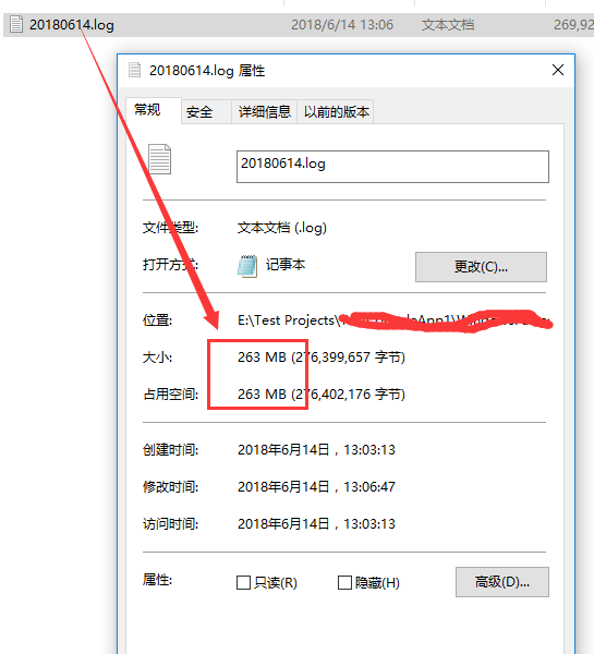 因为采用异步,故方法先走到结尾,输出了同步的MsgBox,随后弹出的是100W日志输出到文件后的耗时MsgBox,从截图可以看出,不足1S(当然这里的1S不是真实的输出到本地方件,而是把所有的日志推到了Queue中而矣,但不影响不阻塞业务处理),而本地日志文件的大小达到了263MB(设置最大值的MaxSizeBackup,使其不滚动备份),由此看性能是不错的;