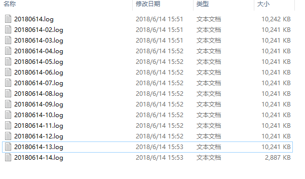 如果采取滚动备份(设置MaxSizeBackup为一个合理值,默认为10MB),则生成的日志文件形式如下:(超过最大容量则生成同名文件+2位序号),超过一个月则会自动清除
