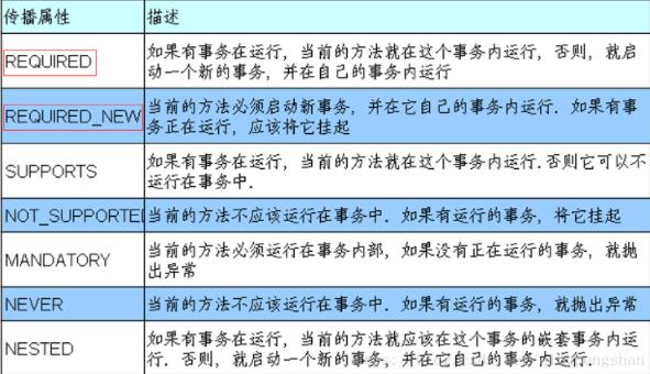 2、事务的传播行为可以由传播属性指定,Spring定义了7种类型的传播行为。其中最常用的是REQUIRED和REQUIRES_NEW。