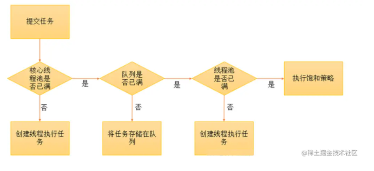 - 当任务队列已满,则在非corePool中创建新的线程来处理任务。