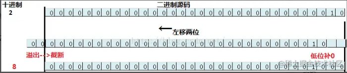 左移位运算符为<<,其运算规则是:按二进制形式把所有的数字向左移动对应的位数,高位移出(舍弃),低位的空位补零。