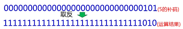 首先把数字5转换成补码形式,之后把每个二进制位上的数字进行取反,如果是0就变成1,如果1就变成0,经过取反后得到的二进制串就是运算结果,此时是补码的形式,需要转回原码,符号位为1,其余各位取反,然后再整个数加1, 这个运算结果被还原为十进制数是-6。