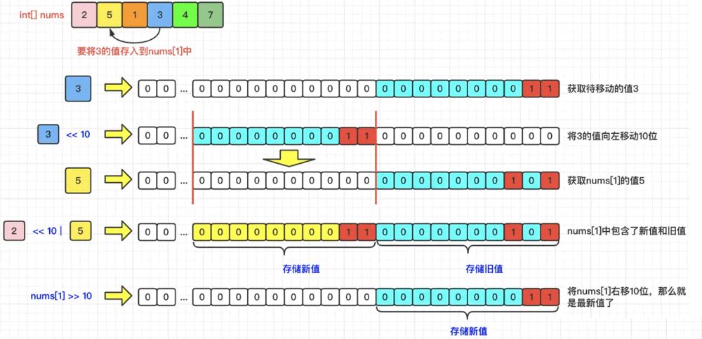- 通过1023换算成二进制1111111111,不足32位,用0补齐,和数组的数值做&运算,可以得到数值的低10位的值。