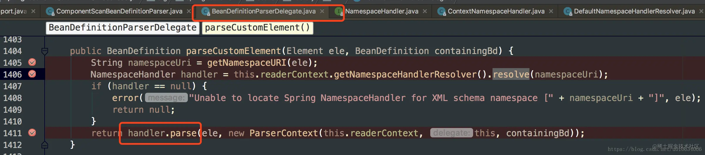 * BeanDefinitionParserDelegate.parseCustomElement 中 在获取到了对应的handler后,会执行handler.parse(ele, new ParserContext(this.readerContext, this, containingBd))方法;