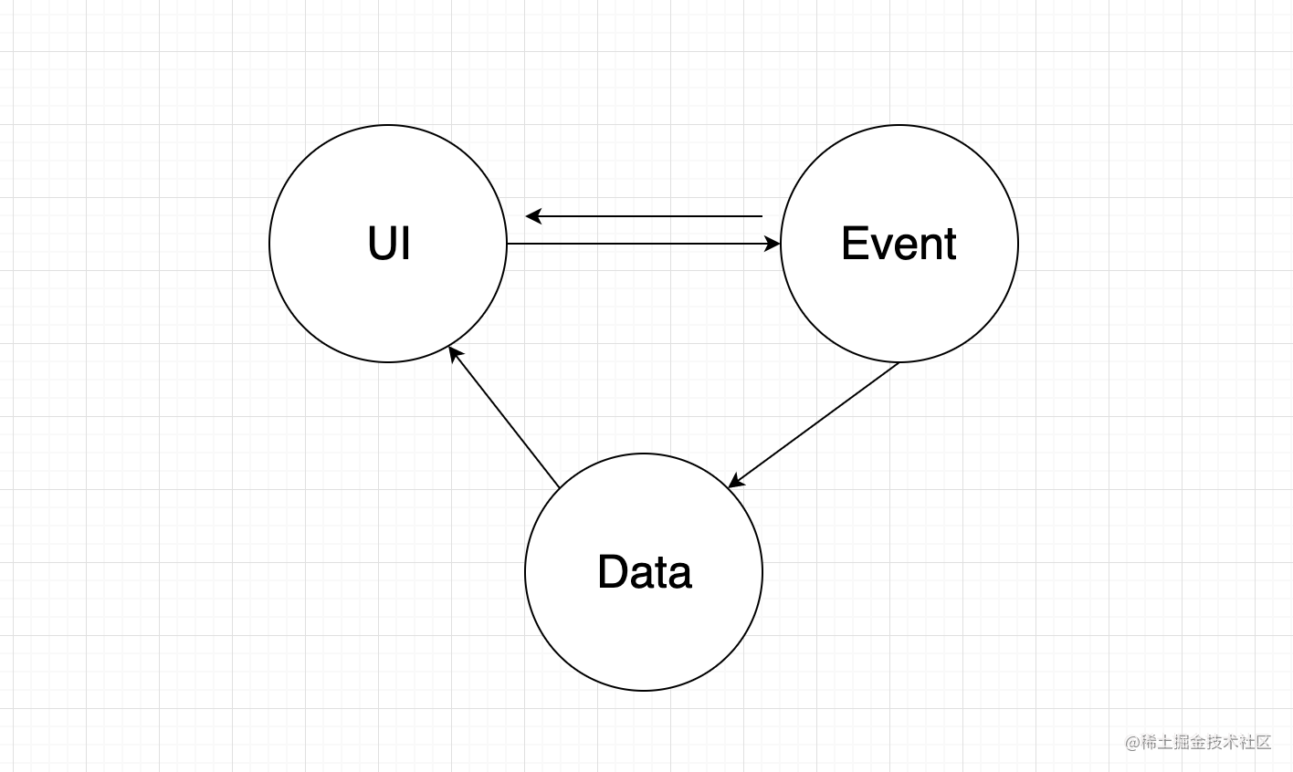 在 数据驱动视图 的时代, 这三个要素的关系往往如下图所示: