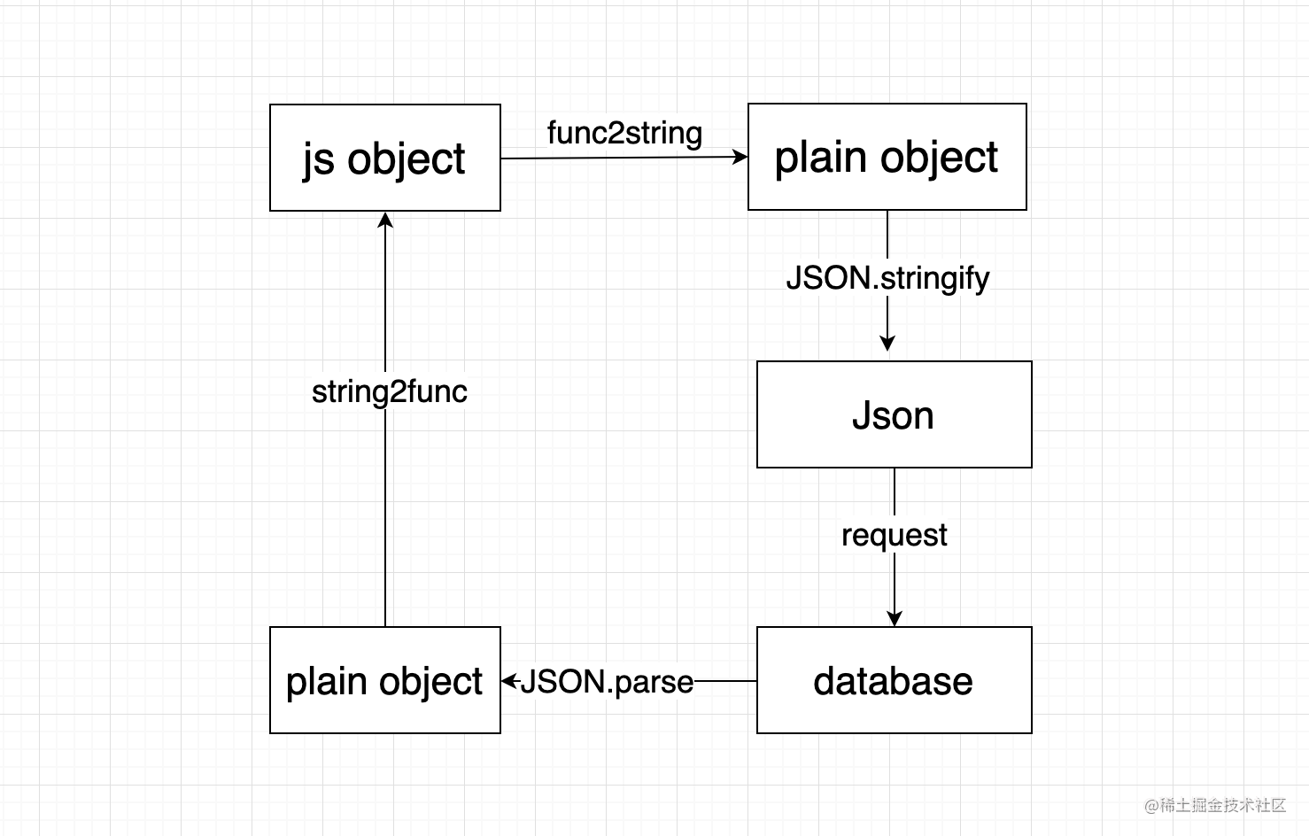也许大家会想到先将函数转换成字符串, 再用 JSON.stringify 序列化后保存到后端, 最后在组件使用的时候再用 eval 或者 Function 将字符串转换成函数. 大致流程如下: