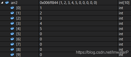 int arr2 [10] = {1, 2, 3, 4, 5};//定义了元素个数,但只给前五个元素赋值,则后五个元素均为0