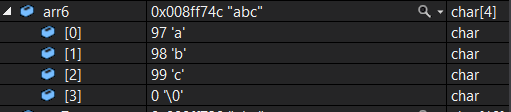 char arr6[] = "abc";//没有定义元素个数,用双引号定义3个字符,末尾数组会自动加上结束标志(\0)