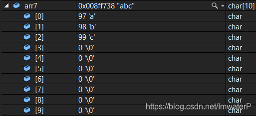 char arr7 [10] = "abc";//定义10个元素个数,用双引号赋值三个字符串,其余7个元素均自动定义为\0