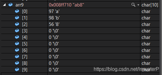 char arr8 [10] = {'a', 'b', 'c'};//定义10个元素个数,用大括号和单引号赋值三个字符串,则数组只含有三个字符,剩余7个均为\0