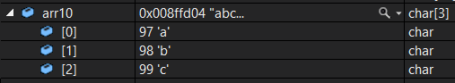 char arr10[] = {'a', 'b', 'c'};//没有定义元素个数,用大括号定义字符串,数组的元素个数则只有三个,结尾没有数组结束标志(\0)