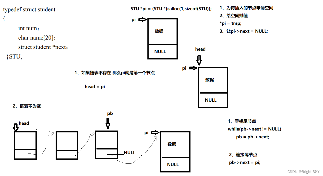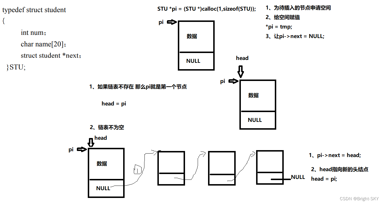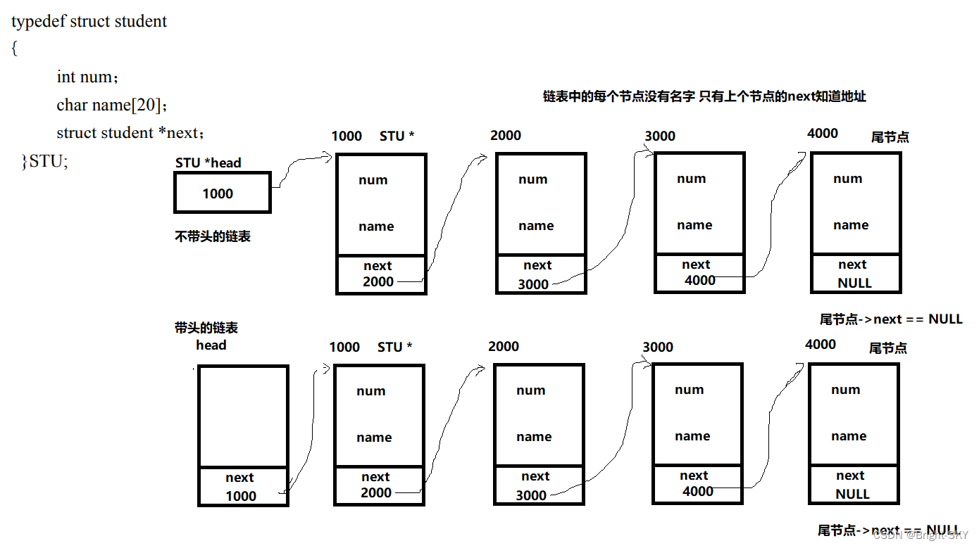 链表由一系列节点(链表中每一个元素称为节点)组成,节点在运行时动态生成(malloc,calloc),每个节点包 括两个部分: