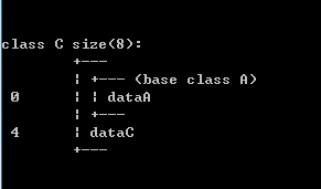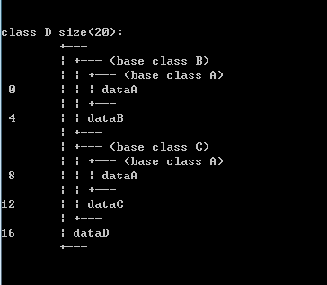 从类D的内存布局可以看到A派生出B和C,B和C中分别包含A的成员。再由B和C派生出D,此时D包含了B和C的成员。这样D中就总共出现了2个A成员。大家注意到左边的几个数字,这几个数字表明了D中各成员在D中排列的起始地址,D中的五个成员变量(B::dataA、dataB、C::dataA、dataC、dataD)各占用4个字节,sizeof(D) = 20。