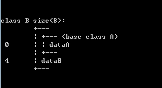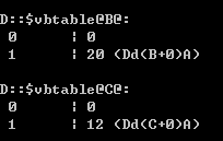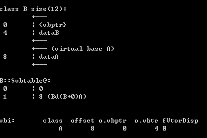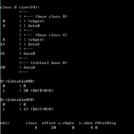 实际上,vbptr指的是虚基类表指针(virtual base table pointer),该指针指向了一个虚表(virtual table),虚表中记录了vbptr与本类的偏移地址;第二项是vbptr到共有基类元素之间的偏移量。在这个例子中,类B中的vbptr指向了虚表D::$vbtable@B@,虚表表明公共基类A的成员变量dataA距离类B开始处的位移为20,这样就找到了成员变量dataA,而虚继承也不用像普通多继承那样维持着公共基类的两份同样的拷贝,节省了存储空间。