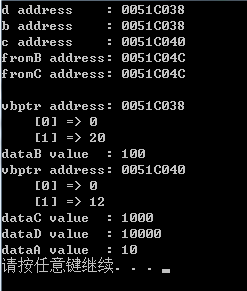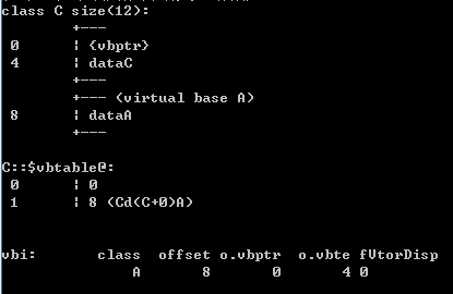 我们可以看到,菱形继承体系中的子类在内存布局上和普通多继承体系中的子类类有很大的不一样。对于类B和C,sizeof的值变成了12,除了包含类A的成员变量dataA外还多了一个指针vbptr,类D除了继承B、C各自的成员变量dataB、dataA和自己的成员变量外,还有两个分别属于B、C的指针。