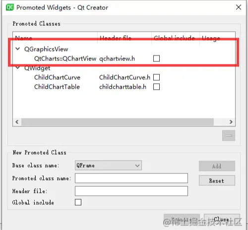 在Designer中拖出一个GrahpiceView控件,提升成QChart类。