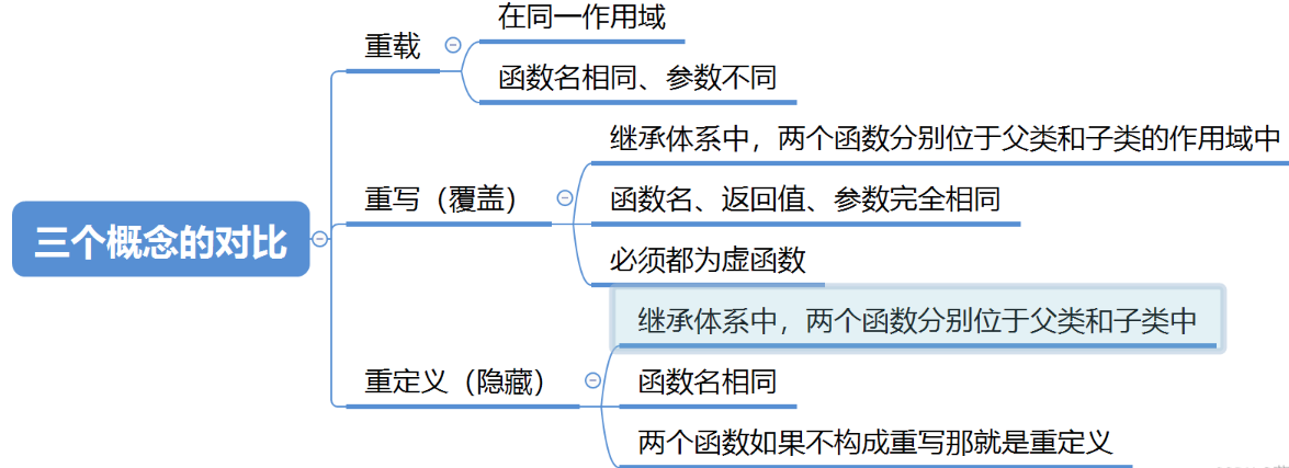 重写(覆盖):派生类中有一个跟基类中完全相同的虚函数(三同:即派生类虚函数与基类虚函数的返回值类型、函数名字、参数列表完全相同,也有例外!),这样则称子类重写了父类的虚函数。