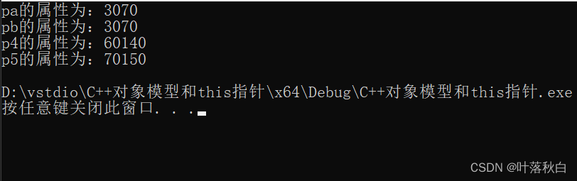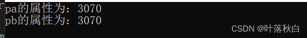 }定义Person类,声明两个整型属性,我们都知道在类内定义的函数为成员函数或者方法;这个成员函数的返回值为Person类型,意为返回的话会自动调用编译器提供的拷贝构造函数,这个在前面的文章已经提到过,这里注意函数名不要自定义了,就写operator+,英文意思就是’+‘操作,这样定义符合编译器规范,可以使用简化版的运算,然后参数也是Person类型的,这是因为我们的目的就是要实现自定义类型的运算;该函数的实现也很简单,就是将各属性相加后的结果返回给新的对象;主函数中pa和pb的两个属性均会相等,pa的调用是重载的本质调用,pb的则是简化的调用,看一下运行结果: