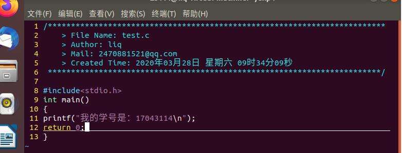 我们可以通过vim编辑器编写一个最简单的C语言程序,如写一个输出自己学号的程序。先创建一个文 件夹,然后进入该新创建的文件夹。