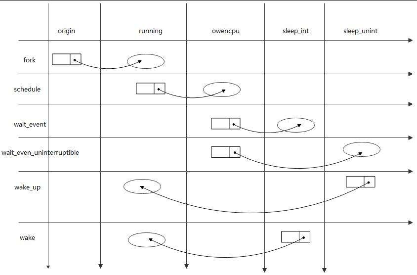 假设当前进程处于running状态下,那么只有schedule事件发生之后,该进程才会产生状态的迁移,迁移到owencpu状态下,如果在此状态下发生了其他的事件,比如wake、wait_event都不会导致状态的迁移。