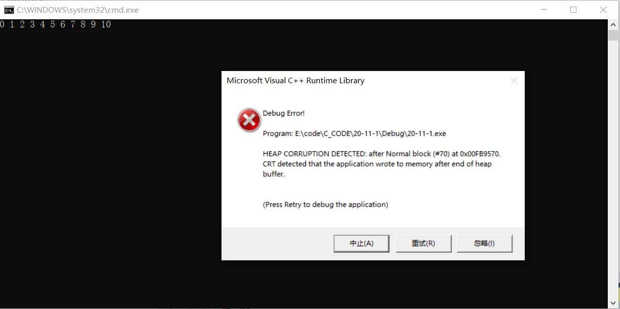 上述代码中开辟了10个整型的空间,而在访问的时候赋值的时候赋值了11整型的空间,这就发生了越界访问的情况,就会出错。