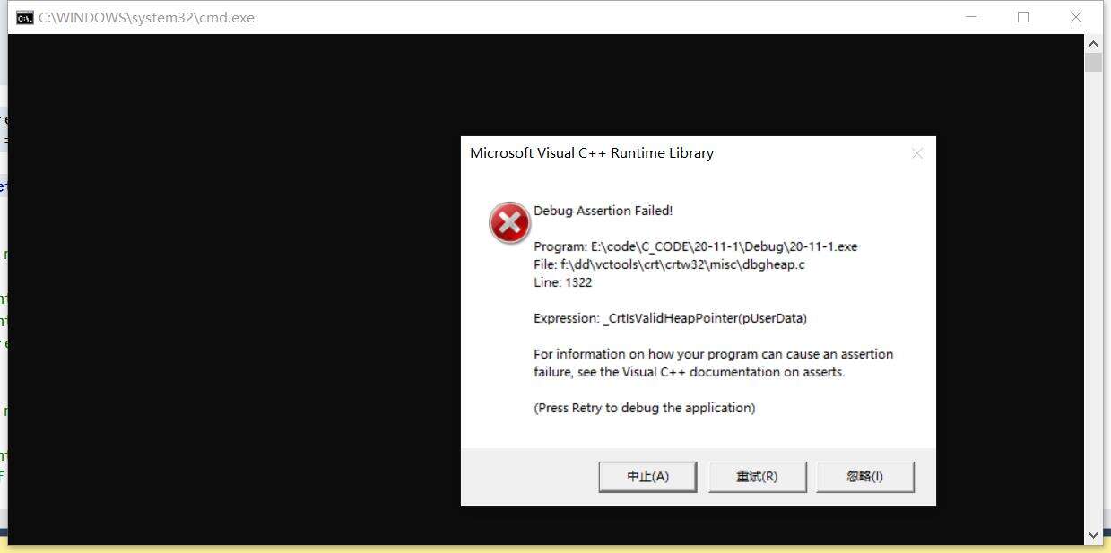 这段代码在先释放掉一次动态空间之后,又释放了一次,第二次释放的时候这块空间已经不属于这个程序了,所以会出错。这种问题一般发生在多个函数传参的问题中,就是我们在一个函数中把动态内存释放了,但是在另一个空间中又释放了一次,所以就会出错了。