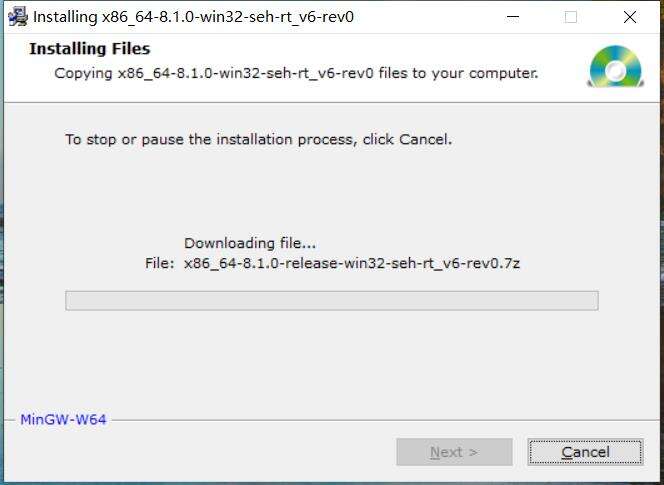 - “1.15 开始下载 MinGW-w64 本体”时进度一直不动。