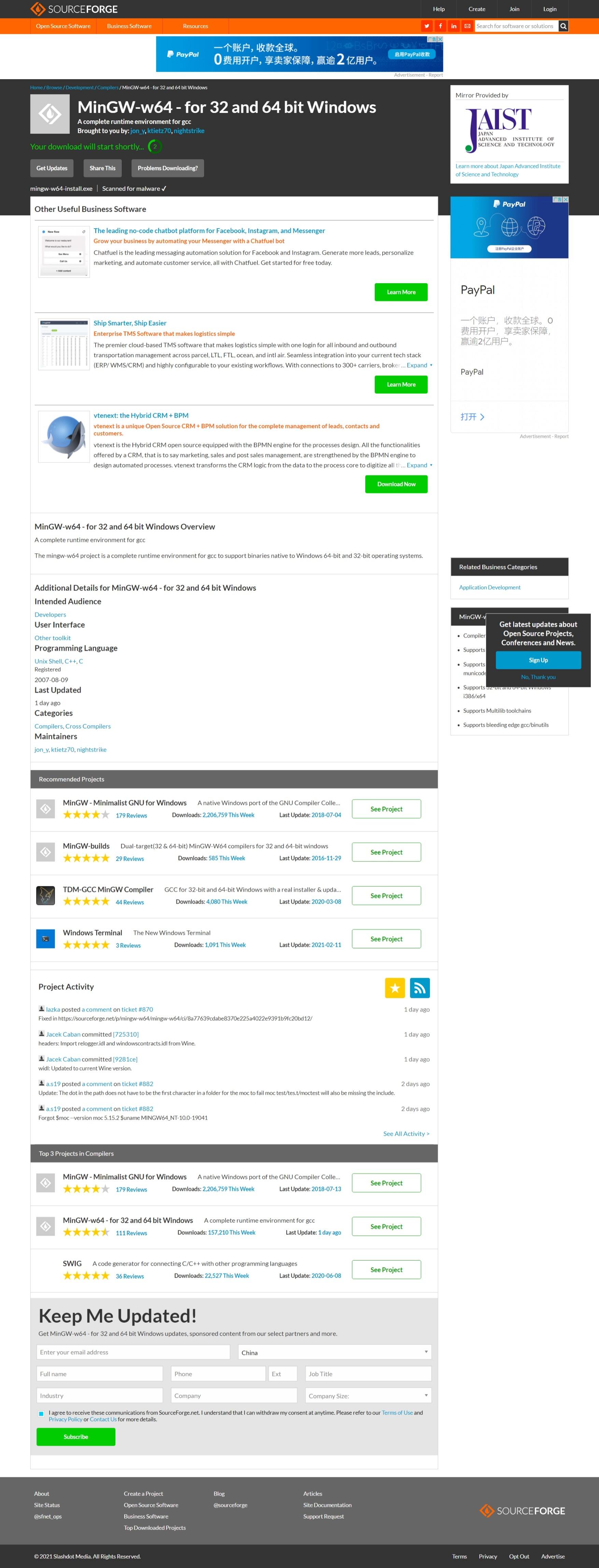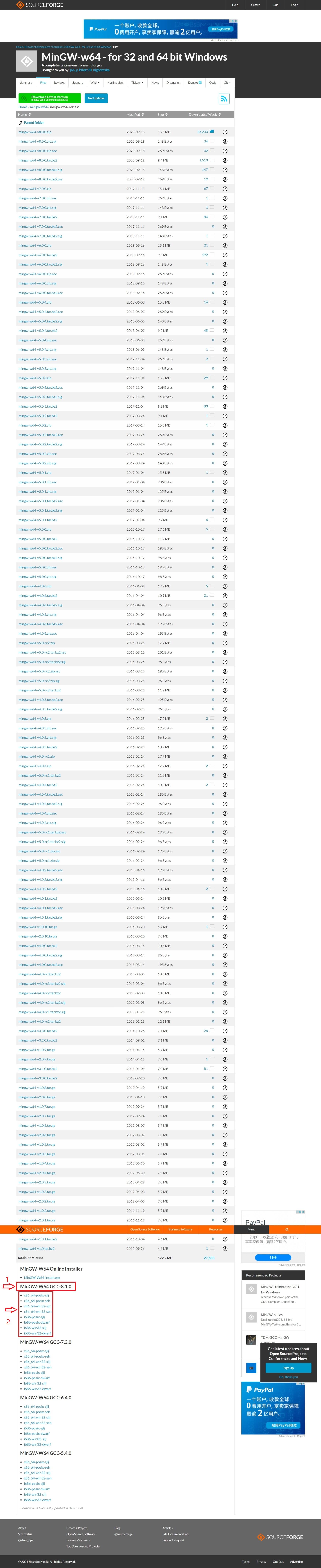 进入 SourceForge 中的 MinGW-w64 下载页面,显示如下图