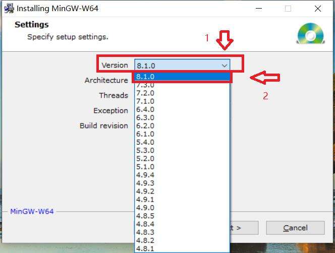 找到箭头1所指标题 MinGW-W64 GCC-8.1.0 ,在箭头2处找到所需的版本。