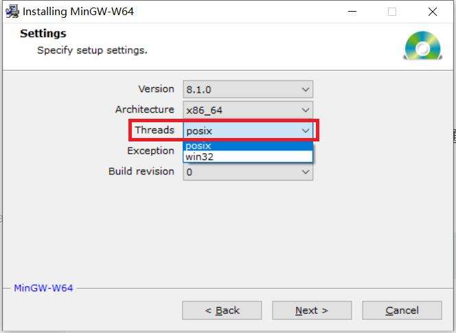 Threads 选项表示编译器添加的系统接口协议,如果编写的程序未来在Windows系统上运行则选择 win32,开发 Linux、Unix、Mac OS 等其他操作系统下的程序,则需要选择 posix 。