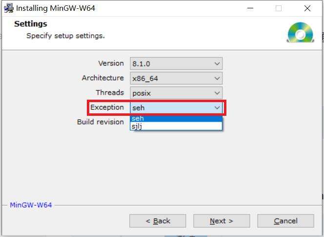 如果你之前选择了 64位,则这里有两个异常处理模型供你选择,seh 是新发明的,而 sjlj 则是古老的。seh 性能比较好,但不支持 32位。 sjlj 稳定性好,支持 32位。这里选择 seh 。