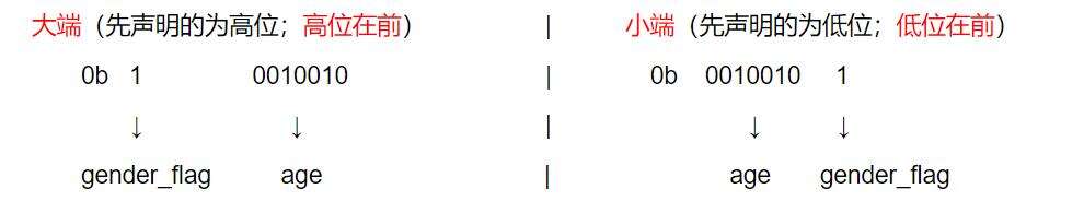其中 gender_flag 与 age 共用了一个字节(8bit)的空间,一个占1bit,一个占7bit;但是bit占的位置却是与平台相关的;就有可能出现如下两种排列情况: