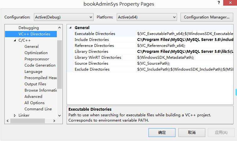2.将文件夹MySQL目录下的include添加到VC++目录中的包含目录中,另外将文件夹MySQL目录下的lib添加到VC++目录中的库目录中