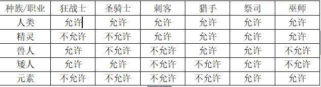 很多职业会限制某些种族选择,例如兽人不能就职圣骑士等等,种族和职业的限制表如下: